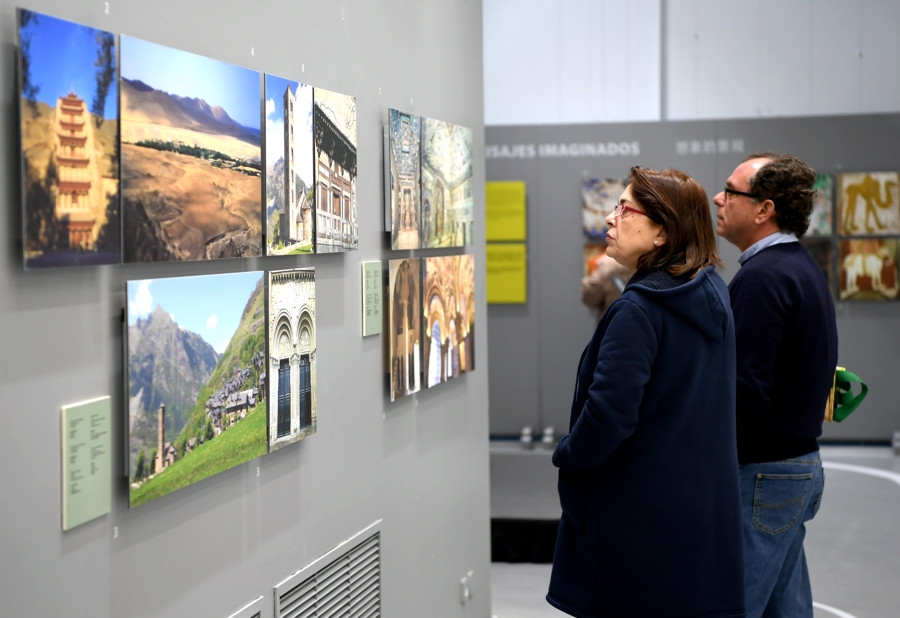 在西班牙马德里,市民参观由马德里中国文化中心、马德里孔子学院和敦煌研究院等联合举办的《朝圣之路·圣迹——从敦煌到伊比利亚半岛》主题展览。 新华社发