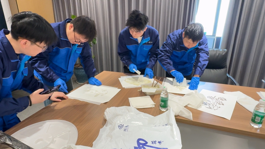 活动发轫,郁弘晋对蓝印花布的历史渊源、民间听说和工艺经过伸开细巧陶冶,让员工们恍悟这项非遗身手的文化底蕴与特有魔力。2006年,南通蓝印花布印染身手列入首批国度级非物资文化遗产。