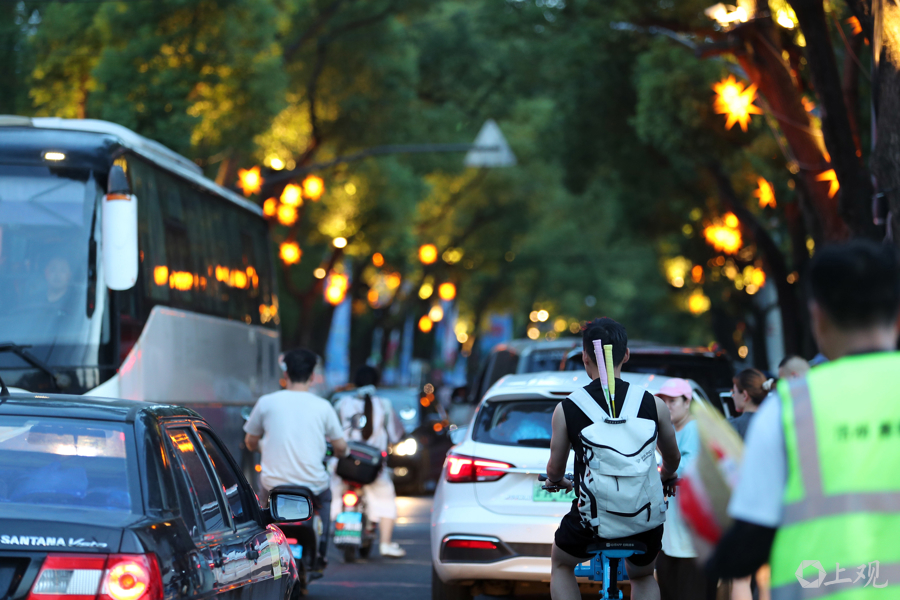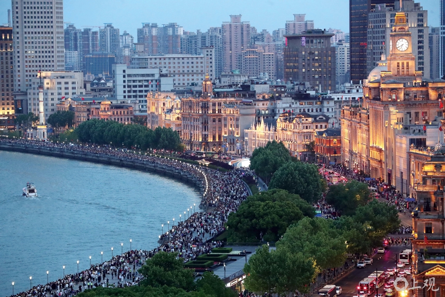 2025年5月3日傍晚,外白渡桥从黄浦外滩涌向虹口北外滩的游客摩肩接踵,警方采取西进东出的措施,确保客流出行安全顺畅。