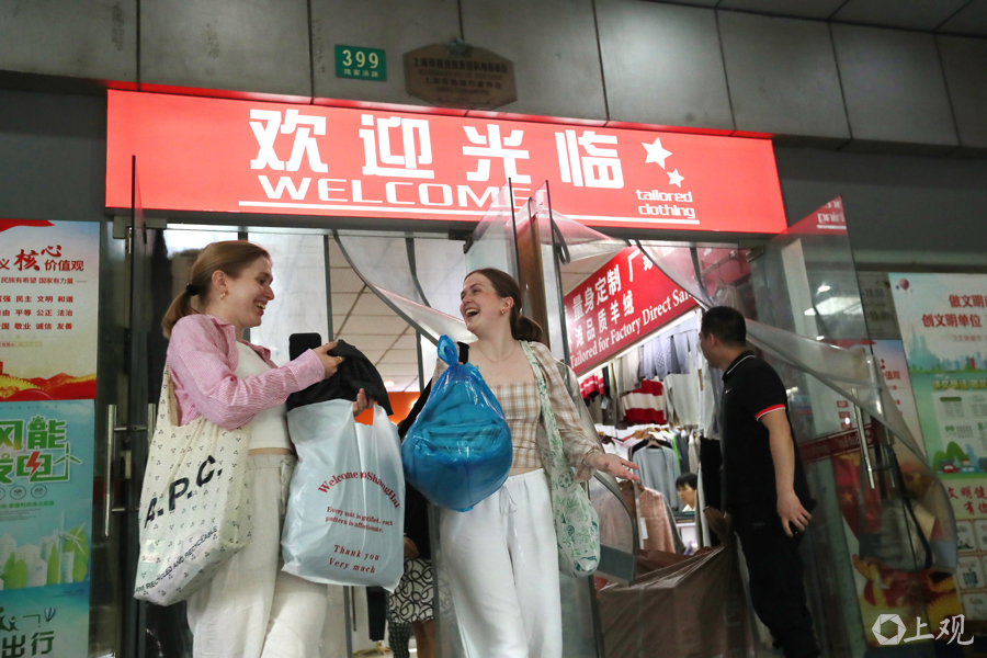 2025年5月中旬,25岁的德国女孩何佳灵(左)和妹妹拎着大包小包,走出南外滩面料市场。这是她们来上海旅游的“第一站”。随着中国“免签朋友圈”的逐步扩大,更多外国游客可以更便捷地来到上海游览消费。