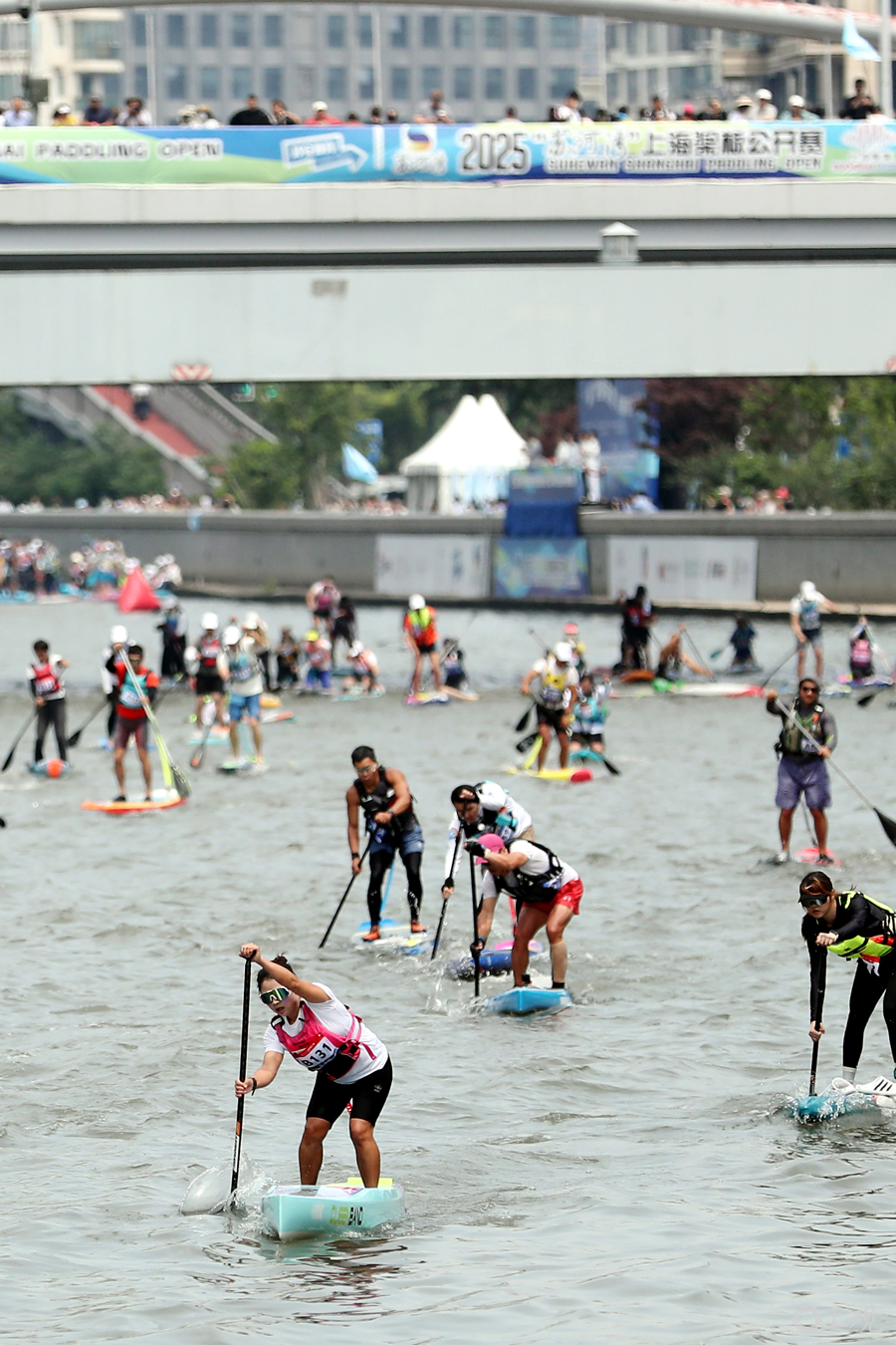 2025年5月24日,苏河湾上海桨板公开赛在苏州河静安段举行,来自长三角地区的400余位桨板爱好者,感受吃、住、行、游、购、娱全方位配套消费服务。
