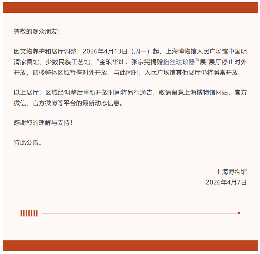 因文物养护和展厅退换,2026年4月13日(周一)起,上海博物馆东谈主民广场馆中国明清产物馆、少数民族工艺馆、“金琅华灿:张宗宪捐赠掐丝搪瓷器展”展厅罢手对外盛开,四楼合座区域暂停对外盛开。与此同期,东谈主民广场馆其他展厅仍将照常盛开。
