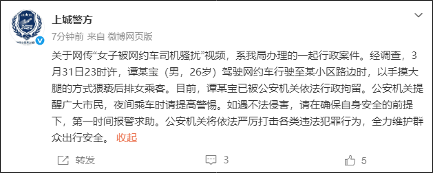 对于网传“女子被网约车司机扰攘”视频,系我局办理的一皆行政案件。经打听,3月31日23时许,谭某宝(男,26岁)驾驶网约车行驶至某小区路边时,以手摸大腿的方式猥亵后排女乘客。
